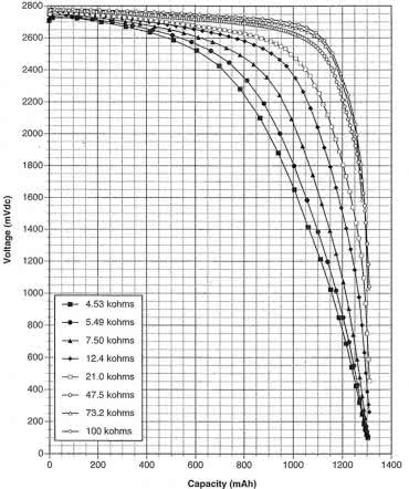 Z uwagi na tradycyjny już zakres zastosowań baterii litowo-jodowych – zdecydowanie najczęściej można je znaleźć w rozrusznikach – producenci podają zwykle charakterystyki rozładowania dla stałego obciążenia rezystancją 100 kΩ. Nie ma w tym jednak nic dziwnego – większość kardiostymulatorów operuje właśnie w zakresie prądu (uśrednionego) w zakresie kilku… kilkunastu µA, zaś zwiększanie obciążenia bardzo szybko obniża napięcie ogniwa – patrz rysunek 31.