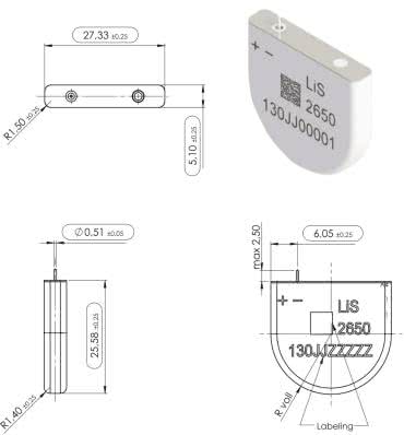 Przykładową baterię „katalogową” – LiS 2650 marki Litronik – pokazano na rysunku 32. Metalowa puszka, z jednej strony tradycyjnie zaokrąglona, ma wymiary całkowite 27,33×25,58×5,1 mm, co daje łączną objętość 2,7 cm³. Nominalne napięcie ogniwa to 2,8 V, pojemność dla rozładowania rezystancją 100 kΩ wynosi 1,21 Ah, zaś poziom samorozładowania nie przekracza 7% dla 10-letniego okresu użytkowania.