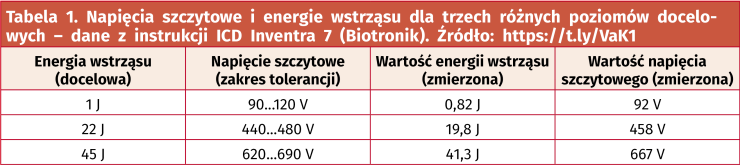 Większość kardiowerterów-defibrylatorów oferuje energię maksymalną na poziomie do 35 J, zaś w przypadku modeli określanych jako ultra-high energy górną granicą może być nawet wartość 42 J. Uzyskanie tak dużej ilości energii jest możliwe dzięki zastosowaniu przetwornicy typu flyback, podwyższającej napięcie baterii (rzędu 2,8...3,2 V) do kilkuset woltów, przy czym warto wiedzieć, że narastające zbocze impulsu terapeutycznego może wiązać się z przepływem prądu na poziomie nawet kilkunastu amperów (!). Wartości energii odpowiadającej określonym napięciom szczytowym można znaleźć w materiałach producentów – przykładowe dane dla ICD z serii Inventra 7 marki Biotronik podano w tabeli 1.