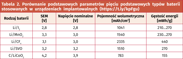 Ze względów bezpieczeństwa współczesne baterie są wykonywane w hermetycznych obudowach (fotografia 19), przy czym metalowa puszka jest zwykle połączona galwanicznie z jedną z elektrod (często z anodą, choć nie jest to uniwersalna reguła). Podsumowanie najważniejszych parametrów pięciu typów baterii stosowanych w urządzeniach wszczepialnych zestawiono w tabeli 2.