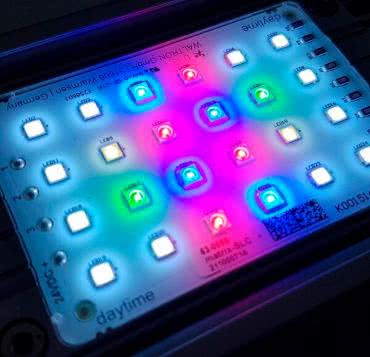 Główną różnicą między światłami LED do uprawy a zwykłymi światłami LED jest szerokość i kształt widma światła. Oświetlenie dla roślin wymaga szerszego spektrum długości fal niż oświetlenie zapewniające komfort widzenia i samopoczucia oraz wymaga uwydatnienia pewnych barw. Gotowe panele LED zawierają najczęściej wiele diod o różnych barwach od UV do IR (fotografia 8), które umożliwiają precyzyjne kształtowanie widma. Przykładowy panel został pokazany na fotografii 9, a jego widmo zostało pokazane na rysunku 11.