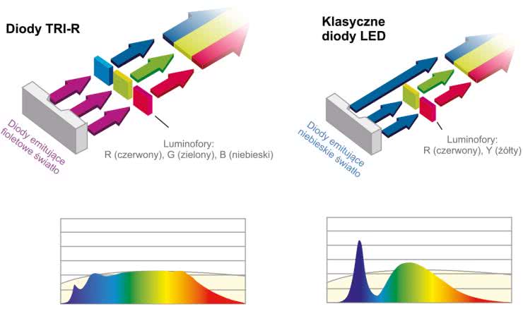 Zbliżenie widma sztucznego oświetlenia LED do światła naturalnego minimalizuje braki sztucznych źródeł światła. Takie naturalne widmo światła (tzw. SunLike) zostało uzyskane np. dzięki technologii TRI-R (rysunek 10), która zawiera fioletowe struktury LED w połączeniu z trzema luminoforami. Dzięki takiemu rozwiązaniu możliwe staje się wytwarzanie światła o widmie odpowiadającym zdrowemu naturalnemu światłu dziennemu.