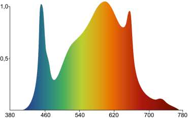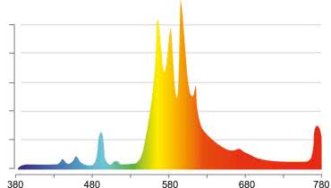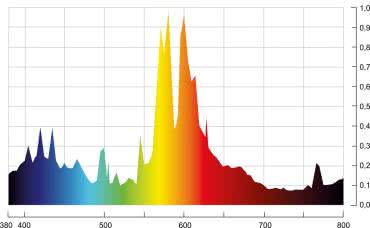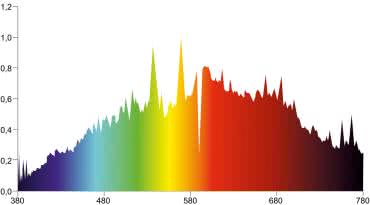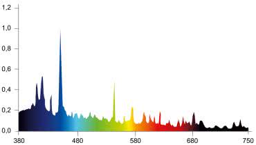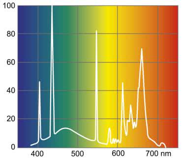 Świetlówki kompaktowe nie emitują równomiernego spektrum. Emitują światło o określonej temperaturze barwowej, która wskazuje na odcień wytwarzanego przez nie światła. Niski poziom temperatury barwowej daje cieplejszy, żółtopomarańczowy kolor, a wysoki oznacza, że emisja ma chłodniejszy, niebieskawy odcień. Widmo świetlówki o temperaturze barwowej 8500 K przeznaczonej do uprawy roślin, zostało pokazane na rysunku 9.