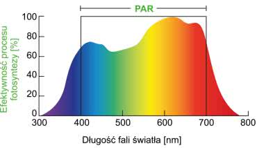 Nie całe światło z zakresu PAR prowadzi do intensywnej fotosyntezy. Dla dokładnego zobrazowania całego widma pod tym względem powstała tzw. krzywa McCree (rysunek 3), nazywana czasami krzywą wrażliwości roślin (Plant Sensitivity Curve). Na wykresie widać, że chlorofil wykorzystuje zwłaszcza dwa zakresy PAR - niebieski (ok. 450 nm) oraz czerwony (ok. 640 nm). Kluczową sprawą, oprócz dobrania odpowiednich długości fali, jest odpowiednia dobrana proporcja światła czerwonego do niebieskiego. Oczywiście inne długości spektrum PAR są również potrzebne roślinom, jednak fotosynteza zachodzi najintensywniej w świetle niebieskim i czerwonym.