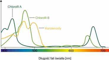 Oba rodzaje chlorofilu działają wspólnie, aby umożliwić maksymalną absorpcję w widmie światła dziennego. Występują także pigmenty pomocnicze - karotenoidy, obecne w wielu organizmach fotosyntetyzujących, które zwiększają gównie absorpcję światła zielonego. Przybliżoną zdolność absorpcji tych 3 struktur pokazuje rysunek 2. Na bazie tych informacji został określony zakres widma światła, którego roślina używa do fotosyntezy, nazywa się PAR (Photosynthetic Active Radiation) i mieści się w zakresie długości fali od 400 do 700 nm.