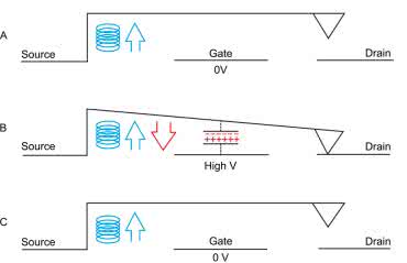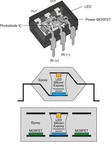 Budowa optoprzekaźników bazuje na koncepcji nieco zbliżonej do klasycznego transoptora (rysunek 13) – w tym przypadku jednak światło wewnętrznej diody LED nie powoduje zamknięcia obwodu wtórnego w sposób bezpośredni (tj. przez zwiększenie prądu kolektora fototranzystora), ale pada na fotodiodę (a raczej zestaw połączonych szeregowo fotodiod) po stronie wyjściowej. Napięcie wygenerowane przez taki mikroskopijny generator fotowoltaiczny otwiera następnie parę połączonych źródłami tranzystorów MOSFET (rysunek 14), pełniących rolę właściwego elementu kluczującego.
