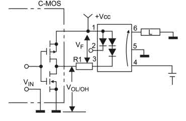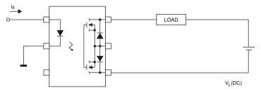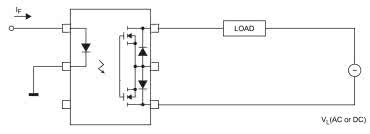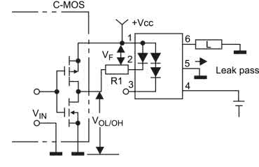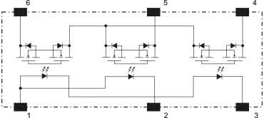 Wbrew pozorom, układ nie jest dwu-, a tym bardziej trzykanałową wersją klasycznego, prostego optoprzekaźnika – w rzeczywistości jest to rozbudowana konstrukcja jednokanałowa. Za sterowanie obciążeniem odpowiadają struktury MOSFET, połączone z wyprowadzeniami 4 i 6. Dodatkowa, środkowa sekcja, podłączona do pinu nr 5, służy niejako do... odprowadzania prądów upływu tranzystorów wyjściowych do masy obwodu wtórnego. W stanie włączenia przekaźnika (tj. zwarcia linii 4 i 6 przez skrajne sekcje MOSFET), dioda podłączona do linii nr 2 jest nieaktywna, podobnie jak odpowiadająca jej, środkowa część sekcji wyjściowej (rysunek 19).