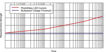 Warto dodać, że pomimo niekwestionowanych zalet, jakie prezentują projektantom optoprzekaźniki, elementy te nie są rzecz jasna pozbawione pewnych wad. Jedną z nich podkreśla w swojej nocie aplikacyjnej pt. When to Replace a Relay with a Multiplexer firma Texas Instruments. Próbując przekonać swoich odbiorców do tego, że w wielu układach opłaca się zastąpić optoprzekaźniki nowoczesnymi multiplekserami analogowymi, autorzy dokumentu przedstawiają wykres, sugerujący wpływ starzenia diody LED w miarę czasu eksploatacji (rysunek 21) na sukcesywne zwiększanie zapotrzebowania obwodu wejściowego na prąd zasilania.