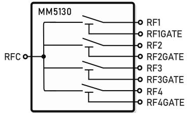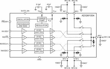 Schemat układu ADGM1004 przedstawiono na rysunku 29. Sekcje styków mikromechanicznych mogą pracować z sygnałami w szerokim spektrum od DC do 13 GHz, należy jednak wspomnieć, że technologia ta również nie jest pozbawiona wad – przykładowo, sterowanie przełączników odbywa się 10...30-krotnie wolniej, niż w przypadku przedstawionego wcześniej układu MM5130 (czasy włączania i wyłączania dochodzą do 75 μs).