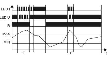 Przykładowo – w najprostszej konfiguracji (oznaczonej jako OD) przekaźnik wyjściowy jest wyłączany, jeżeli wartość prądu przekroczy nastawę zadaną za pomocą pokrętła MAX i stan ten utrzyma się przez czas T ustalony za pomocą pokrętła DELAY. Powrót do stanu załączenia jest możliwy wtedy, gdy prąd w obwodzie spadnie poniżej wartości ustawionej pokrętłem MIN (rysunek 32).