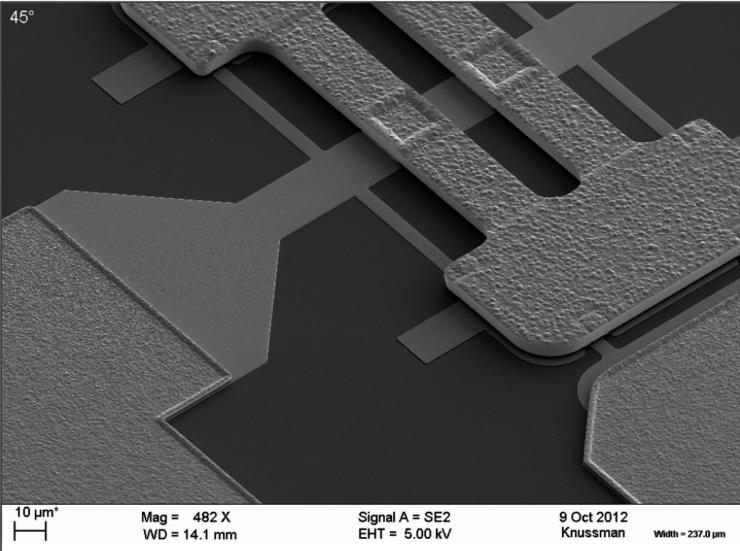 Inną wersję technologii wykorzystuje firma Menlo, m.in. w układzie MM5130 (fotografia 18). Układ opiera się na elastycznej belce, zawieszonej na dwóch podparciach nad statyczną elektrodą, pokrytą cienką warstwą słabego dielektryka. Odchylenie belki za pomocą pola elektrycznego powoduje jej ugięcie i w efekcie dociśnięcie do powierzchni dielektryka.