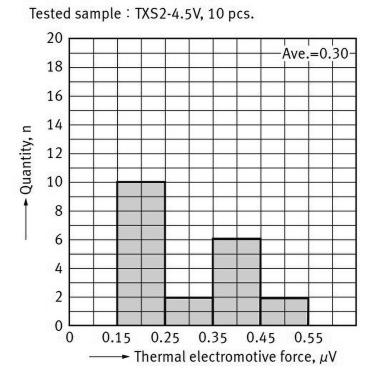 Z tego też względu niektórzy producenci przekaźników do precyzyjnych aplikacji pomiarowych dostarczają dokładniejsze informacje na temat napięcia termoelektrycznego styków – za przykład mogą nam tutaj posłużyć przekaźniki z serii TX-S marki Panasonic (fotografia 2), dla których producent nie tylko określił przybliżoną, średnią wartość napięcia termoelektrycznego w normalnych warunkach pracy (0,3 μV), ale przygotował nawet stosowny histogram, wykonany na bazie 10 próbek komponentów (rysunek 2).