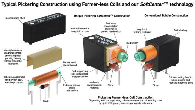Mało tego – w ramach tej samej rodziny produktów znajdują się też wykonania koncentryczne, oferujące kontrolowaną impedancję falową 50 Ω i umożliwiające pracę z częstotliwościami do 2,5 GHz. Warto też dodać, że przekaźniki marki Pickering cechują się wybitnie wysoką rezystancją izolacji (1012 Ω!) oraz krótkimi czasami przełączania (0,5 ms/0,2 ms) i niskimi progami pojemności pasożytniczych (1,5 pF od styków do cewki, 0,15 pF pomiędzy rozłączonymi stykami), co pozwala na zastosowanie ich w zaawansowanych macierzach przełączników, m.in. w automatycznych systemach testujących. Tym bardziej, że footprint tych podzespołów mieści się w wymiarach 10×3,7 mm!