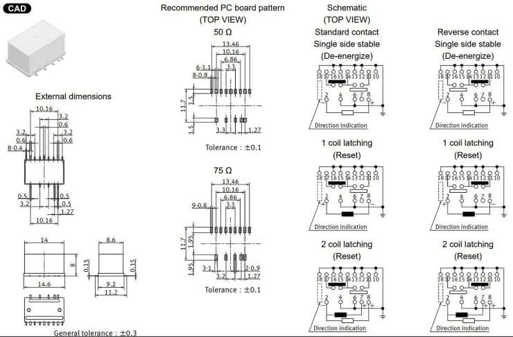 Podzespoły są wyposażone w 100-miliwatowe cewki o napięciu nominalnym 3, 4,5, 5, 12 oraz 24 V i mogą pracować z obciążeniem do 125 V AC/0,3 A, lub 30 V DC/1 A (1 W dla częstotliwości 1 GHz).