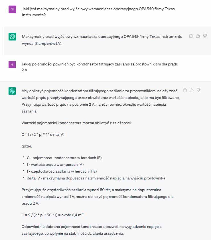 Inżynierowie elektronicy mogą korzystać z ChatGPT na różne sposoby w trakcie swojej pracy. Na przykład, można użyć ChatGPT do uzyskania odpowiedzi na pytania związane z projektowaniem urządzeń elektronicznych, itd. Dzięki swojej zdolności do generowania naturalnie brzmiących odpowiedzi, ChatGPT może być przydatny do rozwiązywania problemów, których nie można łatwo znaleźć w dokumentacji lub innych źródłach informacji – rysunki 1 i 2.