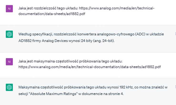 Pisząc o AI, w szczególności o algorytmach takich jak ChatGPT, za rzadko podkreśla się jedną rzecz – jest to przede wszystkim algorytm do generowania tekstu. Oczywiście – jest on wytrenowany na ogromnej ilości tekstu (w przypadku ChatGPT-3 było to 570 GB tekstu, co odpowiada 300 miliardom słów), więc ma całkiem sporą wiedzę i całkiem nieźle radzi sobie z jej używaniem, jednak, gdy jej nie ma, to nie jest świadomy swojej niewiedzy i konstruuje tekst tak, aby był on poprawny i spójny z naszymi oczekiwaniami… a nie zawsze prawdziwy. Jeśli spojrzymy na rysunek 1a, to odpowiedź jest w 100% prawdziwa i poprawna, a już na pytanie na rysunku 1b nie udzielił on w pełni poprawnej odpowiedzi, chociaż na pierwszy rzut oka wydaje się ona poprawna i zasadniczo daleka od prawdy nie jest. Z kolei na rysunku 2, o ile odpowiedzi na pytania są poprawne, o tyle chatbot uparcie (autor konwersował z ChatGPT dalej na temat AD1852) nazywał ten przetwornik ADC, mimo że w rzeczywistości jest to DAC. Tego typu artefakty nazywane są zbiorczo halucynacjami i są jednym z podstawowych problemów dużych modeli językowych (LLM).
