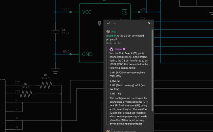 - Flux – jest to asystent AI copilot, który zapewnia w czasie rzeczywistym istotne informacje czy wskazówki, pozwalające na łatwiejsze podejmowanie decyzji projektowych. Dodatkowo Flux eliminuje powtarzające się zadania i zapewnia bibliotekę komponentów i szablonów. Copilot ma dostęp do informacji o projekcie, ale obecnie nie może aktywnie go modyfikować. Wykorzystuje informacje projektowe, takie jak opis projektu, lista komponentów, lista połączeń i karty katalogowe, aby zrozumieć pełny kontekst urządzenia. Dzięki tym informacjom Copilot może pomóc w procesie projektowania, przekazując informacje na temat kompatybilnych części, zidentyfikować błędy w projekcie i odpowiadać na konkretne pytania projektującego. Na rysunku 5 pokazano przykładowy ekran tego środowiska wraz z generowanymi poradami.