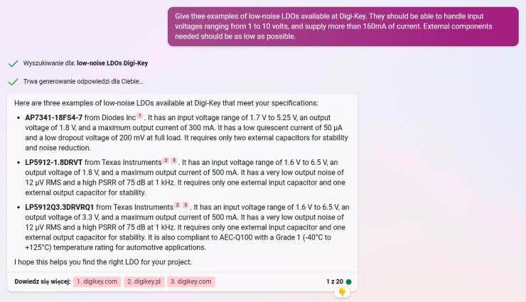 Inne, podobne narzędzia, to np. wyszukiwarka Bing od Microsoftu, która została wzbogacona o chatbota zawierającego podobny model LLM, jak ChatGPT. Dzięki temu, że Bingowe AI jest przede wszystkim wsparciem dla wyszukiwarki, radzi sobie lepiej w serwowaniu informacji (rysunek 3) – są one pełniejsze i dokładniejsze, za to ma większy problem ze zrozumieniem bardziej skomplikowanych zapytań (rysunek 4). Dodatkową zaletą tego narzędzia jest to, że podaje ono źródło (linki) swoich informacji.