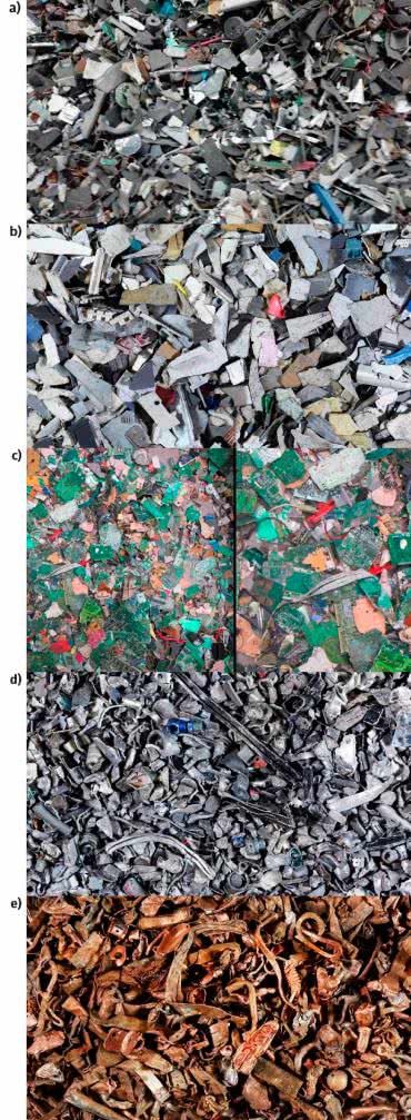 W kolejnym etapie posortowane elementy są umieszczane na taśmie przenośnika i wstrząsane oraz odpylane w celu usunięcia drobnych cząsteczek i kurzu. Celem tej procedury jest zapewnienie, że podczas procesu recyklingu nie dojdzie do degradacji środowiska. Po odsysaniu pyłu następuje separacja metali żelaznych i nieżelaznych, plastiku oraz szkła. Używa się do tego magnesów, wody, metod optycznych i innych pomysłowych rozwiązań. Na fotografii 1a pokazano materiał przed sortowaniem, natomiast na kolejnych znajdują się wydzielone b) tworzywa, c) płytki PCB, d) aluminium, e) miedź. Na koniec rozdzielone odpady są analizowane pod kątem występowania pierwiastków ziem rzadkich i w celu ich odzyskania mogą trafić to tzw. reaktorów chemicznych.