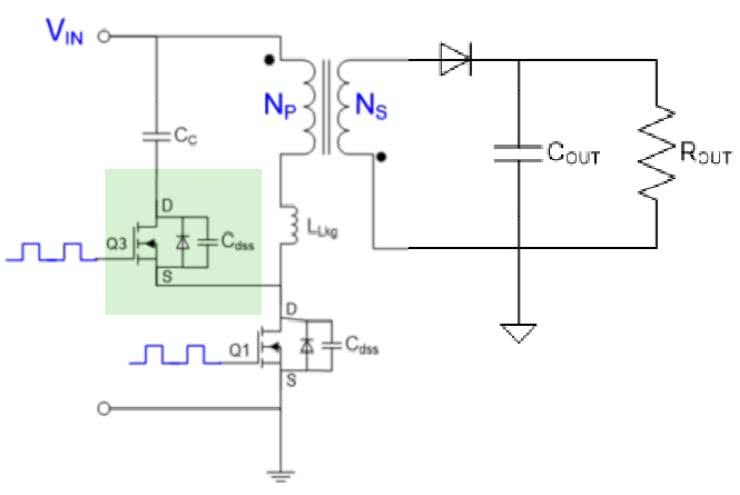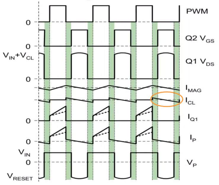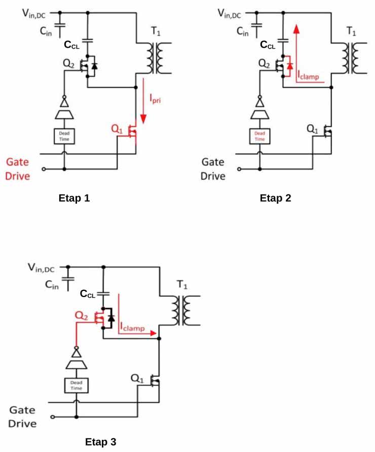 Architektura ACF może przetwarzać energię indukcyjności upływu z powrotem do obciążenia. Gdy przełącznik zasilania Q1 wyłącza się, napięcie spowodowane indukcyjnością upływu (VCLAMP) zaczyna płynąć przez diodę znajdującą się w strukturze Q3, ładując kondensator CC. Następnie włącza się Q3, kontynuując ładowanie pojemności CC. Po pewnym czasie energia zaczyna przepływać z kondensatora do uzwojenia transformatora przez Q3 i rozładowuje indukcyjność upływu.