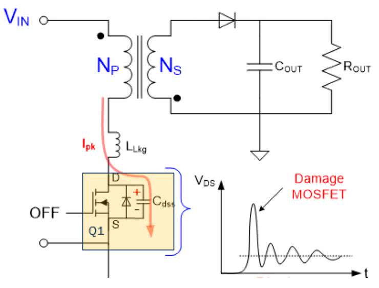 Pod koniec okresu przewodzenia Q1, gdy przełącznik przechodzi do stanu wyłączenia, nie ma obwodu, który mógłby rozproszyć zmagazynowaną energię upływu w rdzeniu magnetycznym transformatora. Istnieje kilka sposobów rozproszenia tej energii, które omówimy w kolejnych rozdziałach.