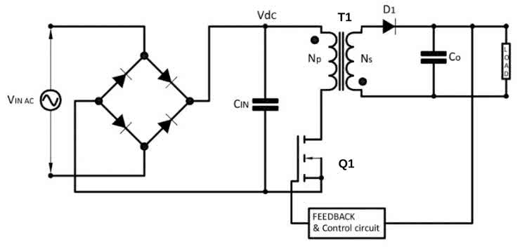 Głównymi elementami konwertera typu Flyback są: przełącznik półprzewodnikowy, obwód sterujący przełącznikiem, transformator, dioda prostownicza i kondensator. Uproszczony schemat został pokazany na rysunku 10.