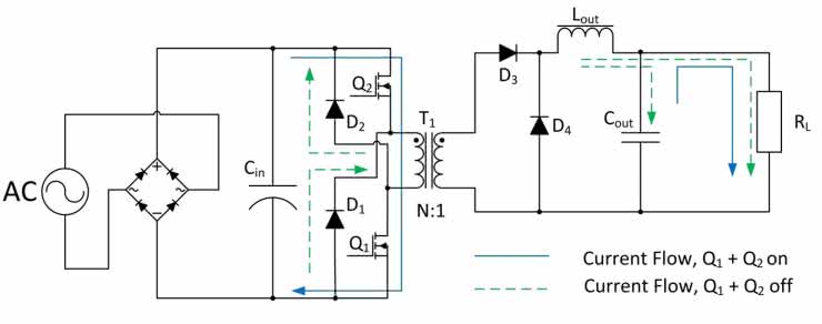 Przełączniki półprzewodnikowe Q1 i Q2 otwierają się i zamykają jednocześnie. Zamknięcie obu przełączników powoduje przenoszenie energii z uzwojenia pierwotnego do wtórnego. W uzwojeniu wtórnym dioda D3 przewodzi energię do cewki wyjściowej i obciążenia. Po otwarciu przełączników energia pozostałości magnetycznej oraz indukcyjności rozproszenia – indukowana w uzwojeniu pierwotnym – płynie przez diody D1 i D2 do źródła zasilania. Natomiast po stronie wtórnej przewodzi wtedy dioda D4, uwalniając energię zgromadzoną w cewce wyjściowej Lo.