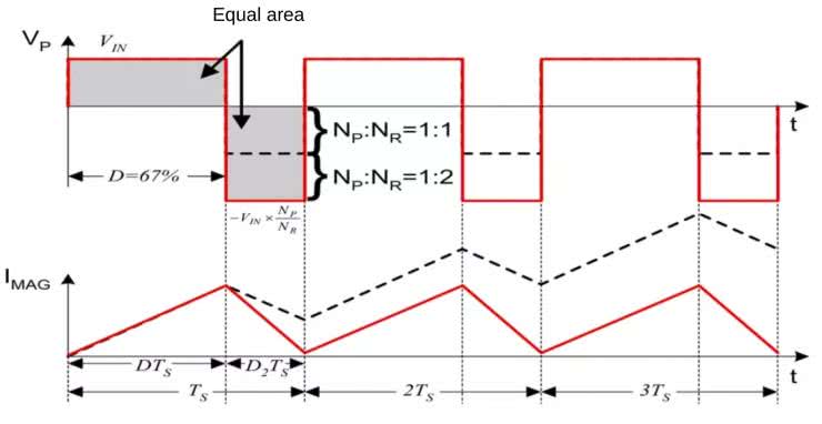 Czas rozmagnesowania można skrócić poprzez zwiększenie liczby zwojów NR. W przypadku, gdy NP/NR=1/2, stosunek czasu aktywnego cyklu do czasu rozmagnesowania przyjmuje wartość 2. Jednak konsekwencją opisanego rozwiązania jest występowanie bardzo wysokiego napięcia na przełączniku półprzewodnikowym, dochodzącego do wartości 3×VIN. Oscylogram dla takiego przypadku został pokazany na rysunku 5. Dla porównania linią przerywaną nakreślono stopień namagnesowania rdzenia dla przypadku NP=NR, ale przy zachowaniu nierównych czasów cyklu aktywnego i rozmagnesowania.