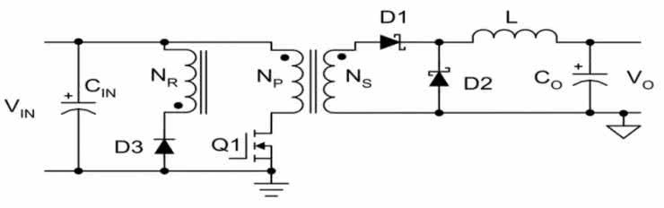 Uzwojenie NR pokazane na schemacie z rysunku 3 określamy mianem uzwojenia resetującego i jest ono zintegrowane z transformatorem. Strumień magnetyczny, zmagazynowany wewnątrz rdzenia, w momencie wyłączenia przełącznika półprzewodnikowego Q1 indukuje ujemne napięcie na końcu uzwojenia NR, które polaryzuje diodę D3 w kierunku przewodzenia do głównej szyny zasilającej. Taki schemat działania pozwala uniknąć nasycenia rdzenia i zwraca energię do pierwotnego źródła zasilania bez znacznych strat, jednak wymaga odpowiedniego transformatora.