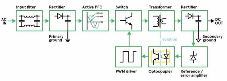 Schemat blokowy typowego zasilacza AC/DC został pokazany na rysunku 1, natomiast na fotografii 1 pokazano przykładowy zasilacz SMPS o mocy 75 W, bazujący na takim schemacie blokowym.