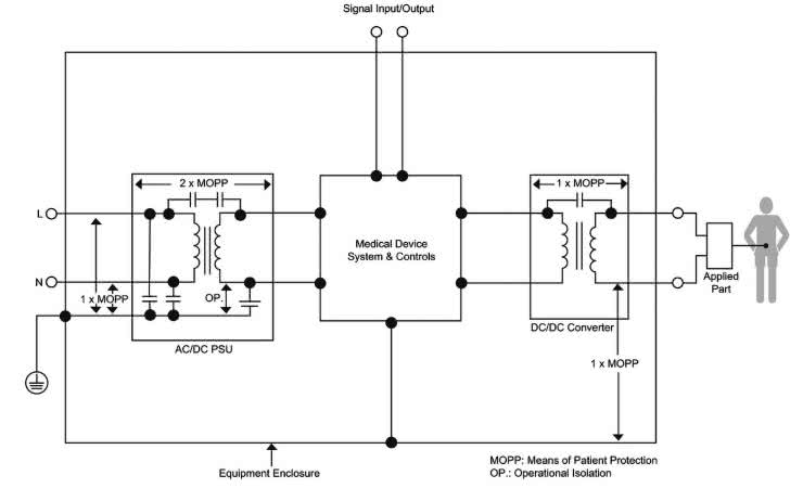 Bardzo istotnym aspektem w zakresie bezpieczeństwa elektrycznego zasilaczy medycznych jest odpowiednia konstrukcja urządzenia, a ściślej rzecz ujmując – właściwa koordynacja izolacji (rysunek 1) czy też rodzaje zastosowanych komponentów pracujących wskroś bariery izolacyjnej (transformatorów, transoptorów, czasem także kondensatorów). Zachowanie wymaganych przez normy wartości parametrów liczbowych – np. natężenia prądów upływu czy wytrzymałości izolacji – nie wystarczy bowiem jeszcze, by dany model zasilacza mógł być stosowany w wyrobach medycznych. Norma 60601-1 jasno definiuje tzw. środki ochrony operatora (MOOP) oraz środki ochrony pacjenta (MOPP), które muszą być zachowane pomiędzy poszczególnymi blokami/elementami całego systemu.