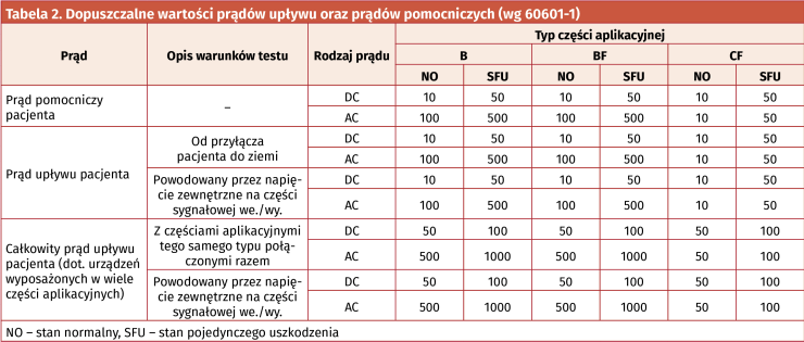 Sprawa nie jest rzecz jasna tak prosta, jak mogłoby się wydawać na podstawie powyższego opisu. Wspomniane wcześniej części aplikacyjne dzielą się bowiem na trzy grupy, określane literami: B, BF oraz CF. Sama część aplikacyjna to element urządzenia, który musi pozostawać w fizycznym kontakcie z ciałem pacjenta, by urządzenie mogło pełnić przewidzianą funkcję. O ile w wielu przypadkach spotykamy się z częściami typu B (o najniższych wymaganiach w zakresie prądów upływu), o tyle kategorie oznaczone dodatkową literą F (ang. Floating – pływający) odnoszą się do tych części aplikacyjnych, które muszą być odizolowane od wszystkich pozostałych podzespołów urządzenia w takim stopniu, by ograniczyć prąd upływu w przypadku wystąpienia zewnętrznego napięcia, przyłożonego pomiędzy pacjenta a potencjał ziemi. Czym zatem różnią się pomiędzy sobą części typu BF i CF? Tylko te drugie mogą być stosowane bezpośrednio na sercu (tj. w operacjach otwartych, procedurach wewnątrznaczyniowych czy chirurgii minimalnie inwazyjnej), a zatem limity prądów upływu są w ich przypadku najbardziej restrykcyjne (tabela 2).