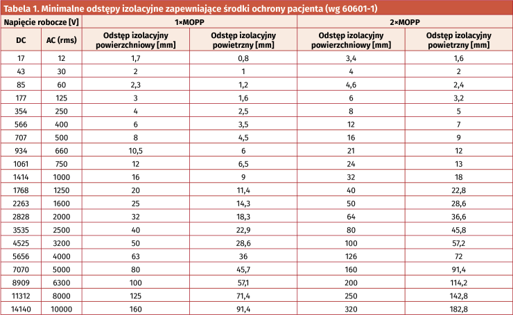 Są to środki służące do redukowania ryzyka porażenia elektrycznego osób mających kontakt z urządzeniem (np. lekarza, pielęgniarki czy technika elektroradiologii) oraz samego pacjenta i, jak nietrudno się domyślić, MOPP stawiają konstruktorom wymogi znacznie bardziej restrykcyjne niż MOOP. Funkcję środka ochrony może pełnić zarówno odstęp powietrzny, jak i powierzchniowy (tabela 1), izolacja stała, impedancja ochronna (np. rezystor szeregowy w kablu EKG), a także połączenie uziemienia ochronnego. Mało tego – standard 60601-1 określa nawet brzegowe warunki pracy urządzenia w wypadkach niektórych rodzajów awarii, rozróżniając np. wartości prądów upływu podczas normalnej pracy urządzenia oraz po wystąpieniu tzw. pojedynczego uszkodzenia.