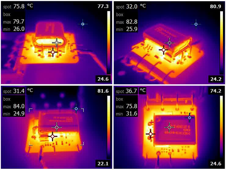 W przypadku układów zasilających, takich jak przetwornice impulsowe, kamery termowizyjne pozwalają ocenić jakość rozpraszania ciepła i dobrać odpowiednie materiały termoprzewodzące lub poprawić wentylację obudowy. Na rysunku 7 pokazano termogram sekcji zasilania. Widoczne są nagrzane przetwornice w układzie.