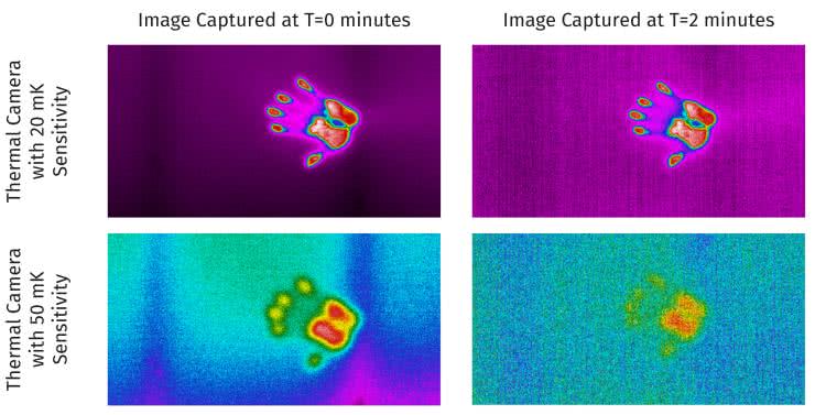 NETD dobrze obrazuje przykład, pokazany na fotografii 2. W tym prostym eksperymencie obrazowany jest termiczny odcisk ciepłej dłoni na zimnym materiale. Różnica temperatur wprowadzona dotykiem nie jest wielka, a z czasem zanika, gdyż materiał stygnie, a temperatura rozkłada się równomierniej po całym materiale. W tym przypadku widać, że aby uchwycić detale odcisku, konieczny jest detektor z mniejszym NETD.