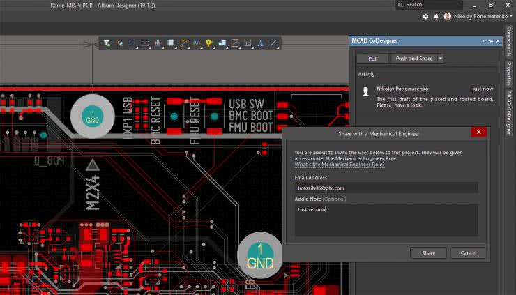 Kluczowym trendem ostatnich lat jest rozwój narzędzi do współpracy ECAD–MCAD, czyli między projektem elektroniki a modelem mechanicznym. Altium promuje dodatek MCAD CoDesigner, który integruje się z popularnymi programami CAD (SolidWorks, PTC Creo, Autodesk Inventor, Siemens NX, a nawet Fusion 360) i umożliwia dwukierunkową synchronizację zmian wprowadzanych przez projektantów PCB oraz konstruktorów mechaniki (rysunek 5). Przykładowo, inżynier mechanik może w swoim programie CAD zaimportować aktualny model płytki z Altiuma (z rozmieszczeniem elementów), wpasować go w obudowę, a jeśli zajdzie potrzeba np. przesunięcia złącza – dokonać tej zmiany i odesłać ją z powrotem do projektanta PCB. Taka integracja, przebiegająca niemal w czasie rzeczywistym, eliminuje przestoje, podczas których elektronik czekał, aż mechanik skończy projekt obudowy, by sprawdzić dopasowanie bądź konstruktor obudowy czekał na poprawki wdrożone przez elektronika. Teraz prace te mogą toczyć się równolegle, a każdy z członków zespołu ma możliwość dodawania komentarzy do aktualizacji, znacznie łatwiejsze jest ponadto przeglądanie wprowadzanych zmian. W środowisku Altium mechanizm CoDesigner jest częścią platformy Altium 365, co pozwala na łatwe współdzielenie modeli 3D płytek z zespołem mechanicznym poprzez chmurę.