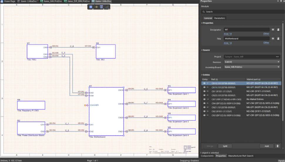 Autorzy tego niezwykle popularnego pakietu EDA wprowadzili specjalny typ projektu zwany Multi-board (z rozszerzeniem pliku *.PrjMbd), w ramach którego można zdefiniować zarówno schemat systemowy łączący poszczególne płytki (*.MbsDoc – patrz rysunek 2), jak i fizyczny montaż 3D całego urządzenia (*.MbaDoc). Na schemacie systemowym umieszcza się bloki reprezentujące poszczególne projekty PCB i definiuje połączenia między nimi (np. wiązki sygnałów przechodzące pomiędzy złączami). Następnie do dokumentu montażowego można zaimportować gotowe projekty PCB poszczególnych płytek i zweryfikować ich wzajemne ułożenie w przestrzeni 3D, sprawdzając dopasowanie złączy oraz kompatybilność całości z obudową. Altium zapewnia przy tym spójność logiczną i fizyczną – narzędzie automatycznie kontroluje zgodność sygnałów na współpracujących złączach. Co więcej, możliwe jest wygenerowanie wspólnej listy materiałowej (BOM) całego systemu w dokumencie ActiveBOM, obejmującej elementy ze wszystkich płytek jednocześnie. Taka scentralizowana tabela komponentów uwzględnia dane o poszczególnych podzespołach (np. dostępność u dystrybutorów, status handlowy, etc.) w czasie rzeczywistym dzięki automatycznej łączności z bazami wielu czołowych hurtowni.