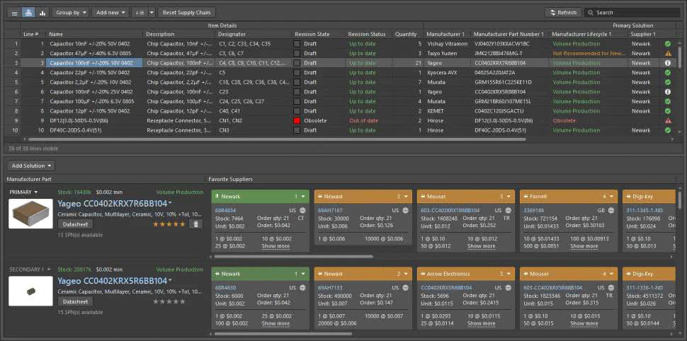 Altium Designer słynie z ogromnej wbudowanej biblioteki oraz możliwości łatwego tworzenia własnych komponentów. Już po instalacji użytkownik otrzymuje dostęp do pewnej podstawowej bazy elementów standardowych, a dodatkowo Altium umożliwia korzystanie z tysięcy komponentów udostępnianych przez producentów na platformie chmurowej. Firma rozwinęła koncepcję centralnej biblioteki, w której użytkownicy mogą przechowywać komponenty zdefiniowane centralnie dla całego przedsiębiorstwa. Taki komponent zawiera nie tylko symbol i footprint, ale też najważniejsze parametry (np. wartości rezystancji czy napięcia), modele symulacyjne i 3D, powiązane informacje o dostawcach czy linki do not katalogowych. Dzięki temu wstawiając element do projektu, inżynier ma od razu aktualne dane o dostępności komponentu na rynku (ceny, ilości w magazynach dystrybutorów, status życia produktu) – Altium realizuje to poprzez funkcję ActiveBOM (rysunek 13) i integrację z Octopart oraz innymi bazami. W rezultacie BOM projektu jest żywym dokumentem, który ostrzeże np., że wybrany układ scalony ma status NRND (nierekomendowany do nowych projektów) lub że brakuje go na rynku (co pozwala zawczasu poszukać zamiennika). To połączenie biblioteki z łańcuchem dostaw jest ogromną zaletą w czasach, gdy dostępność podzespołów bywa wąskim gardłem projektu, co widać było zwłaszcza w trakcie niedawnego, covidowego krachu na rynku półprzewodników.