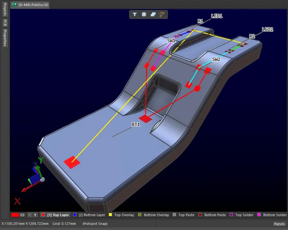 Już teraz Altium eksperymentuje z projektowaniem 3D-MID (Mechatronic Integrated Devices), co zapowiedziano jako nowość w wersji Altium Designer 24. Taka funkcja pozwala projektować ścieżki na zakrzywionych powierzchniach, niejako łącząc CAD mechaniczny i EDA – przyszły projektant będzie zatem mógł rysować ścieżki na modelu obudowy urządzenia, czyniąc z niej jednocześnie obwód drukowany. To kolejny etap integracji, który dziś jest niszowy (spotykany czasem w elektronice noszonej czy motoryzacji), ale może zyskać znaczenie wraz z popularyzacją elektroniki w niestandardowych formach.