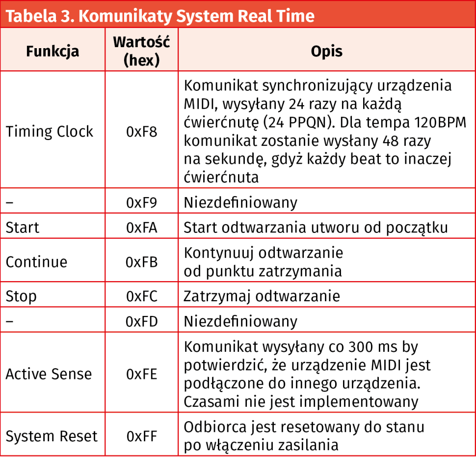 Domyślnym stanem jest stan wysoki, każdy bajt transmitowany jest z bitem startu (stan niski) i zawiera osiem bitów danych, zwieńczonych bitem stopu (stan wysoki). Protokół nie przewiduje bitów parzystości. Prędkość transmisji to 31250 bps, typowy komunikat MIDI zawiera trzy bajty, a jego przesłanie zajmuje niespełna milisekundę. Implementacje USB czy Bluetooth są bardziej złożone; Czytelnik może się z nimi zapoznać sięgając do stosownych specyfikacji, choć od strony protokołu komunikaty są te same.