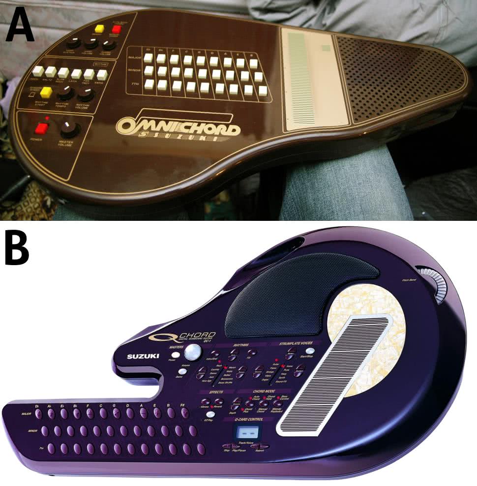Warto na koniec wspomnieć o jeszcze dwóch instrumentach wyprodukowanych wspólnie przez firmy Yamaha i Suzuki: Omnichord i Qchord (fotografia 34). Instrumenty te zastępują tradycyjną klawiaturę układem trzech rzędów klawiszy, grających akordy (stąd nazwa).