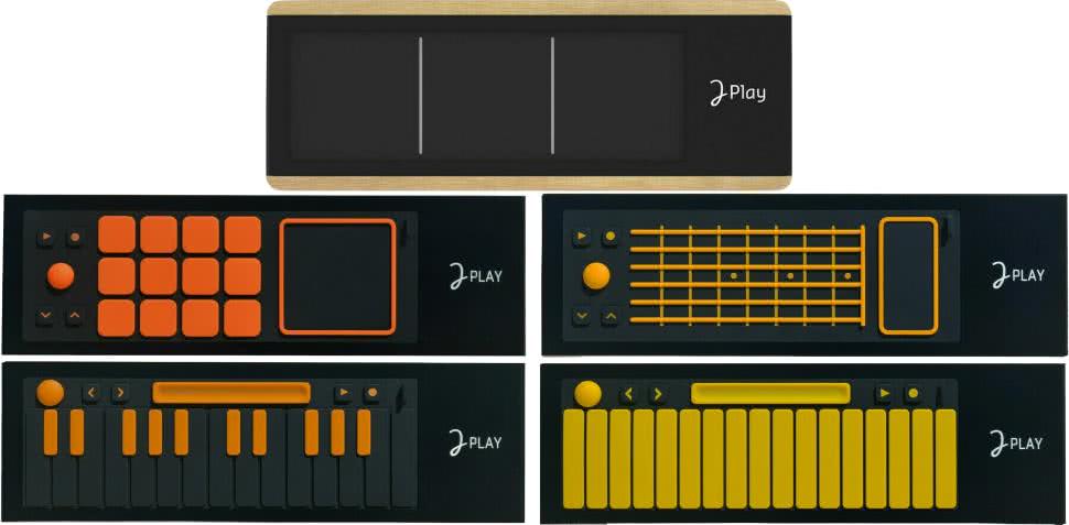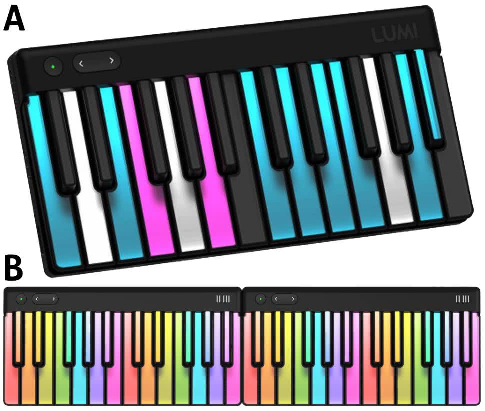 Dwie oktawy klawiszy ułożone są w rzędy, przy czym „czarne” klawisze tkwią między pozostałymi. W teorii ułatwia to grę, bo każdy może zagrać cokolwiek w skali durowej naciskając tylko białe i kolorowe klawisze, i powtarzając na nich różne wzory. Instrument ma wbudowane brzmienia oraz głośnik, a przy swojej wielkości i zasilaniu z wewnętrznego akumulatora jest bardzo przenośny. Obsługuje też MIDI przez USB i Bluetooth. W praktyce jednak należy rozpatrywać taki kontroler raczej jako zabawkę, niż poważny instrument. Innym przykładem jest Joué Play (fotografia 29), kontroler składający się z dwóch części: uniwersalnej powierzchni kontrolnej i nakładek z silikonu. Nakładki te zmieniają funkcje kontrolera: nakładka klawiszowa sprawia, że zachowuje się on jak typowa klawiatura MIDI, a dołączone oprogramowanie wybiera automatycznie właściwy bank brzmień. Nakładka gitarowa pozwala „trącać struny” na silikonowej powierzchni, co też jest rejestrowane.