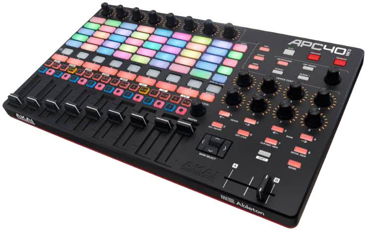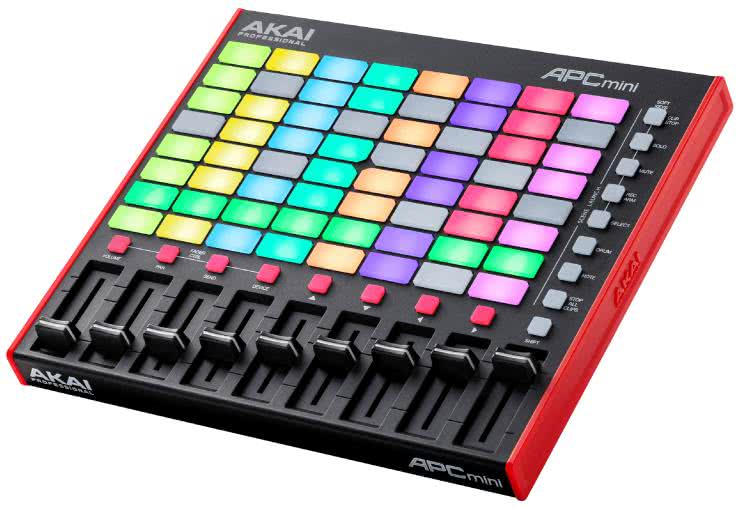 Akai oferuje własne, dedykowane kontrolery dla Ableton Live, jak na przykład APC Mini Mk 2, który ma siatkę 8×8 podświetlanych padów, 9 suwaków dla miksera i gwarantuje pełną integrację z oprogramowaniem. Uwagę zwraca kształt padów – są prostokątne, co widać na fotografii 16.