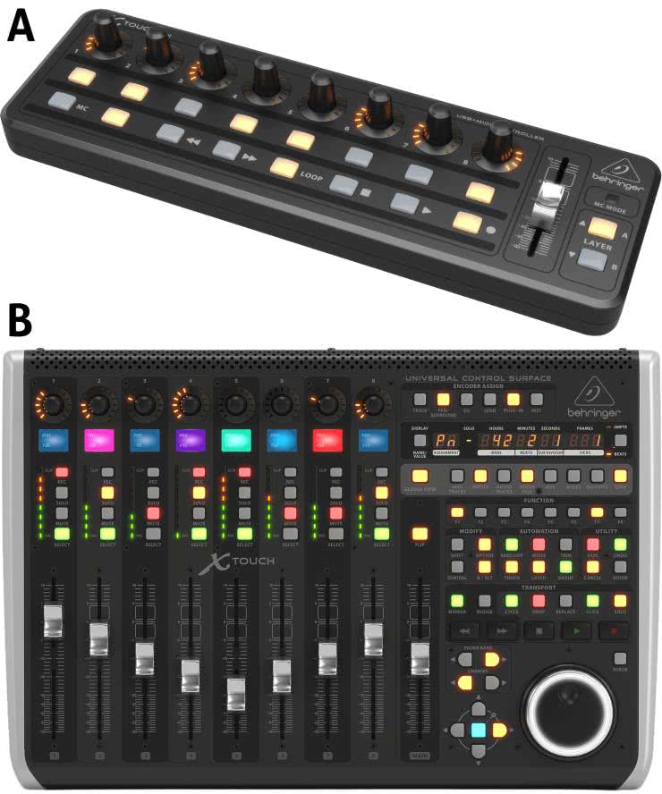 Gdy posiadanie klawiatury muzycznej nie jest konieczne, ale wciąż zachodzi potrzeba fizycznej kontroli programu DAW, przydaje się dedykowany kontroler MIDI. Istnieje szeroka gama produktów spełniających to kryterium. Dla przykładu firma Behringer oferuje szereg produktów z serii X-Touch, a najtańszym z nich jest kontroler X-Touch Mini oferujący osiem enkoderów, osiem przycisków, przyciski transportu oraz suwak. X-Touch ONE z kolei oferuje bardziej rozbudowane funkcje transportu, jak dodatkowe pokrętło JOG i więcej przycisków, kosztem redukcji liczby enkoderów do jednego. Dodatkowo posiada wyświetlacz LED dla parametrów czy wyboru programu. Model Compact oferuje osiem enkoderów oraz dziewięć zmotoryzowanych suwaków i konstrukcyjnie jest dedykowany do kontroli wirtualnych mikserów w programach DAW – suwaki zmieniają pozycję zależnie od tego, jak zmienia się ona w programie DAW, a także przy zmianie grupy parametrów, które kontrolują. Topowy model o oznaczeniu X-Touch (bez żadnych dopisków) łączy cechy wszystkich pozostałych modeli w jeden, rozbudowany kontroler oferujący 9 zmotoryzowanych suwaków czułych na dotyk, 8 enkoderów, 92 podświetlane przyciski, wskaźniki poziomu LED i wyświetlacze LED dla parametrów, a także pokrętło JOG. Dodatkowo kontroler ma własny, aktywny hub USB pozwalający na podłączenie dodatkowych urządzeń bądź kontrolerów.