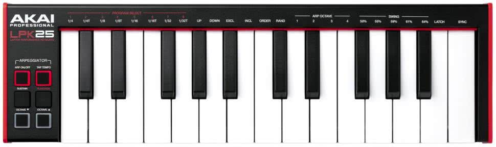 Na koniec warto też dodać, że są na rynku klawiatury sterujące, które nie mają niczego poza samymi klawiszami oraz opcjonalnymi gniazdami dla pedałów sustain i ekspresji. Klawiatury takie zajmują mniej miejsca, a muzyk może wykorzystać inne, dedykowane kontrolery MIDI jako uzupełnienie takiej klawiatury. Przykładem takiej prostej klawiatury sterującej może być Akai LPK25 Mk 2 pokazana na fotografii 11.