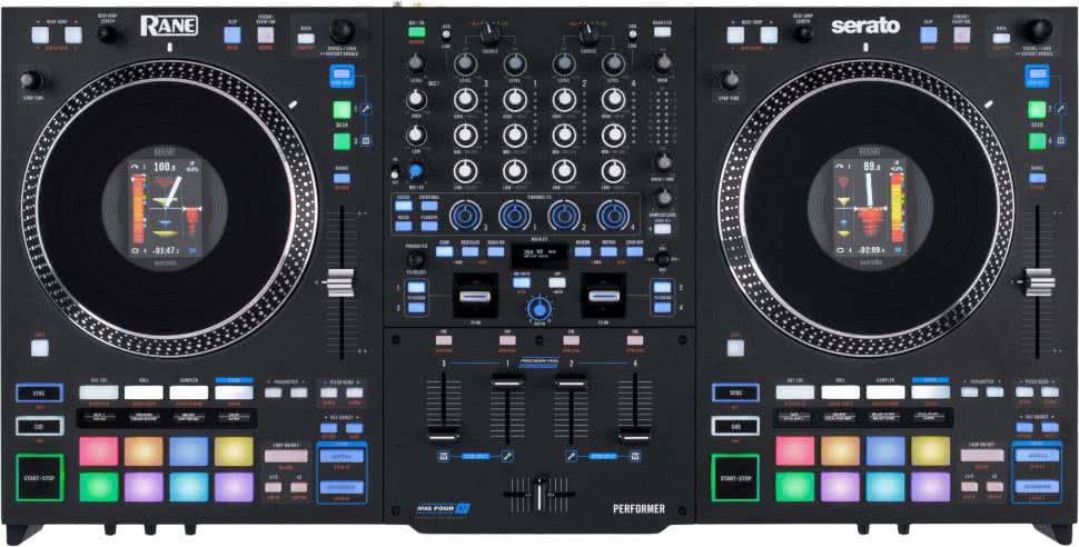 Jednym z droższych kontrolerów w tym segmencie jest Rane DJ Performer (fotografia 22), którego najbardziej unikalną cechą są zmotoryzowane koła JOG emulujące pracę talerzy gramofonów. Jako kontroler MIDI, Performer może pracować z dwoma komputerami naraz, dzięki czemu dwaj DJ-e mogą zmieniać się przy konsoli. Urządzenie posiada zintegrowany interfejs Audio klasy profesjonalnej z szeregiem wejść i wyjść. Wspiera standard DVS (Digital Vinyl System), pozwalający na podłączenie specjalizowanych odtwarzaczy audio, ma też wejścia liniowe i phono, wejścia mikrofonowe XLR, wyjście XLR oraz wyjście słuchawkowe. Funkcje miksowania są realizowane w warstwie sprzętowej urządzenia. Cena tego kontrolera jest jednak kilka razy wyższa od innych wymienionych modeli.