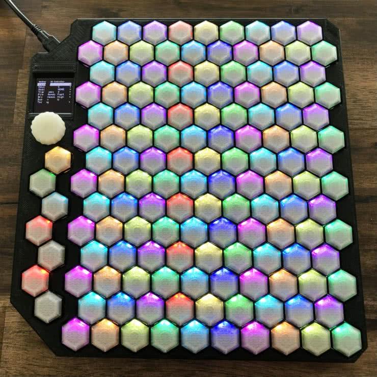 Znacznie tańszym wyborem może być projekt HexBoard (fotografia 33), dostępny zarówno jako zestaw do samodzielnego montażu, jak i kompletne urządzenie. To też jest klawiatura izomorficzna oparta o heksagonalne, podświetlane klawisze, których układ można wybrać. Klawisze nie pozwalają na różnicowanie dynamiki, stąd radykalnie niższa cena. Obudowa jest drukowana i w wersji najtańszej użytkownik musi ją sam wyprodukować, jak i zakupić wszystkie przełączniki. Wersja najdroższa jest kompletna, złożona i działa od razu po uruchomieniu. Sercem klawiatury jest układ RP2040, a firmware jest otwartym oprogramowaniem, które każdy może modyfikować wedle własnych potrzeb. Klawiatura oferuje kilka domyślnych układów gry, a także możliwość wyboru jednej z kilku skal, co ułatwia grę. Każdy półton ma przypisany własny kolor, z czerwonym oznaczającym ton bazowy (który można wybrać). Zdaniem Autora jest to świetna alternatywa dla standardowych klawiatur MIDI, a przy tym dostępna w bardzo przystępnej cenie, przynajmniej w porównaniu do Lumatone.