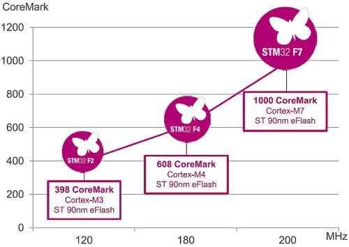 Efekty zabiegów konstruktorów mikrokontrolerów STM32F7 widać w ich wydajności: przy maksymalnej dopuszczalnej częstotliwości taktowania CPU, wynoszącej obecnie 200 MHz, uzyskiwana jest wartość CoreMark na poziomie 1000 (vs 608 w przypadku STM32F4 @180MHz), a zgodnie z wybiegającymi w niezbyt odległą przyszłość zapowiedziami producenta, planowane jest osiągnięcie wyniku testu CoreMark o wartości 2000.