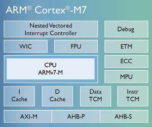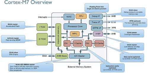 Ważnym, nowym interfejsem komunikacyjnym zastosowanym w rdzeniu Cortex-M7 i mającym wpływ na wypadkową prędkość pracy mikrokontrolera, jest Master AXI (AXIM), który zapewnia "splatanie" kilku kanałów magistrali AHB w jeden, bardzo szybki kanał dwukierunkowej komunikacji rdzenia z otoczeniem (w rdzeniach Cortex-M4 rdzeń komunikuje się z otoczeniem za pomocą "standardowych" interfejsów-magistral AHB). Schemat blokowy rdzenia Cortex-M7 pokazano na rysunku 1, jego pozycjonowanie w ofercie producenta pokazano na rysunku 2.