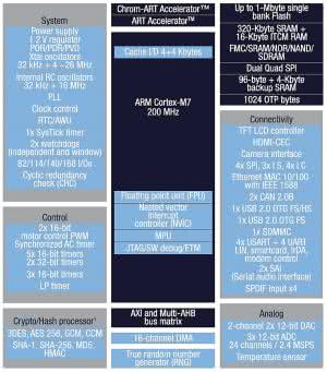Producent opracowując mikrokontrolery STM32F7 zadbał o wyposażenie ich w bogaty zestaw elementów peryferyjnych (schemat blokowy pokazano na rysunku 4), w skład którego wchodzą wszystkie interfejsy znane z poprzednich generacji mikrokontrolerów oraz kilka nowych rozwiązań, w tym m.in.: